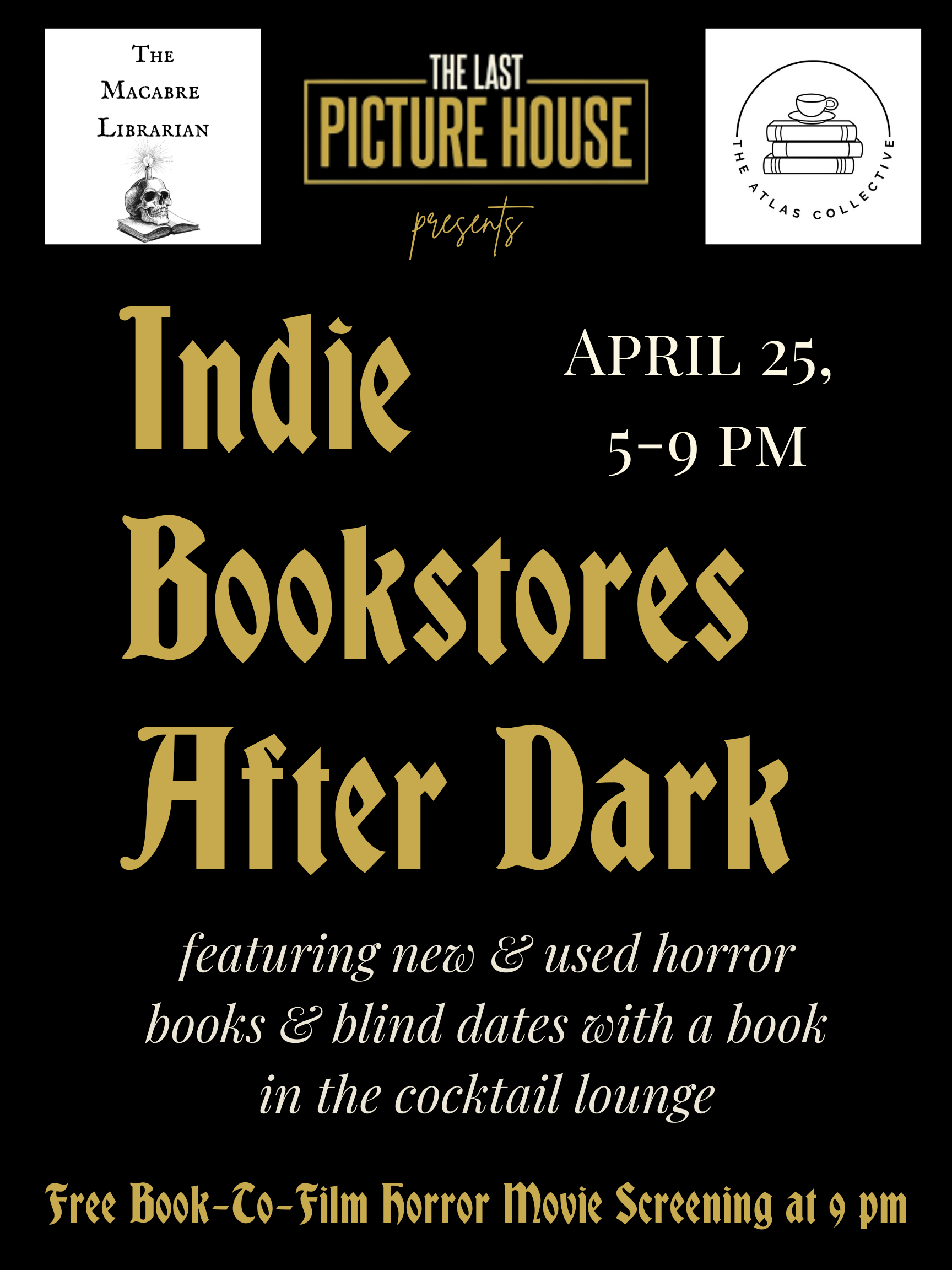 We're beyond excited to announce a one-of-a kind event series debuting at The Last Picture House on Indie Bookstore Day! From 5pm until 9pm, LPH, The Macabre Librarian, and The Atlas Collective are teaming up to offer you a themed experience, featuring new & used horror books & blind dates with a book in the cocktail lounge followed by a free, surprise horror movie screening at 9 pm. The bar will offer a New Orleans-themed drink menu for one night.